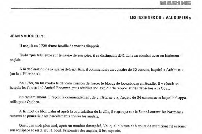 Aujourd’hui, dans le cadre de l’article du mois, nous vous présentons une étude portant sur les bâtiments de la Marine nationale payant porté le nom de Vauquelin. Paru en 1981 sous la plume de Monsieur Alexandre Barbotaud, le texte que vous découvrez a plus de quarante-cinq ans et nous vous le restituons tel qu’il fut imprimé dans notre bulletin à l’époque. Les articles actuels comportent des photographies couleurs en lieu et place de dessins au trait. Puisse cet article trouver de l’intérêt auprès des collectionneurs d’insignes de Marine et plus généralement, donner envie aux internautes de nous rejoindre. Par ailleurs, fin janvier, nous avons mis en ligne de nouveaux articles, consultables via le sommaire général, dont notamment une étude de plusieurs pages portant sur les insignes en tissu des commandos de l’Air (cette fois-ci avec des photos couleurs).